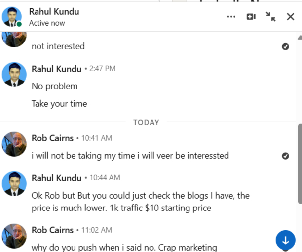 Below is an exchange I had on Linkedin. When I said I am not interessted why push more? This is really bad marketing.